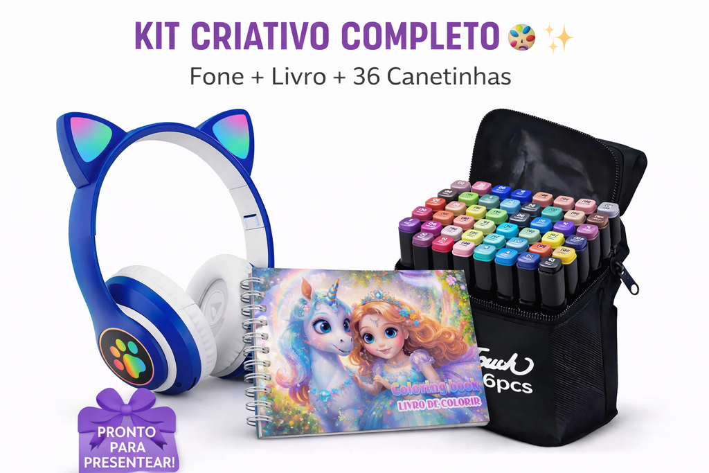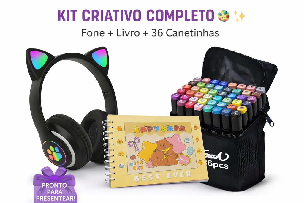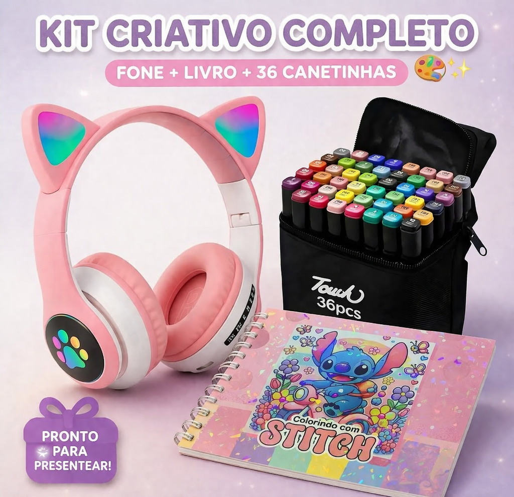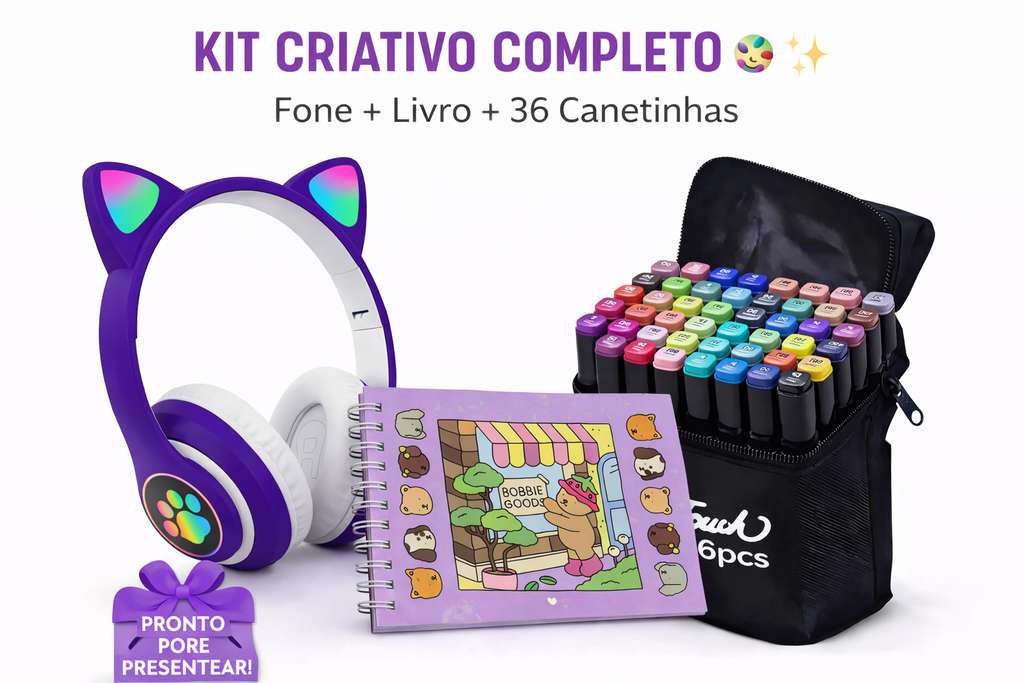 Kit Fone Gatinho + Livro + Canetinhas 36 Cores