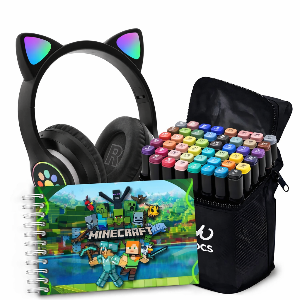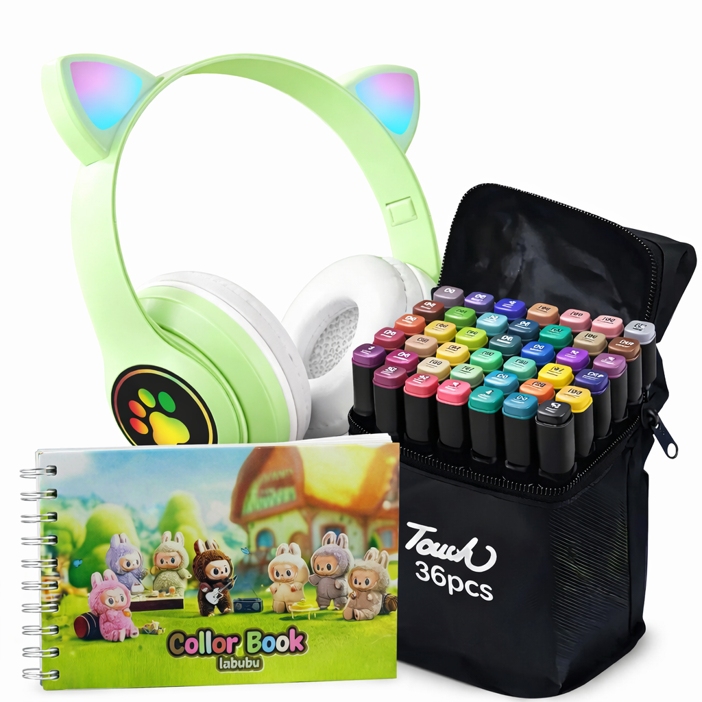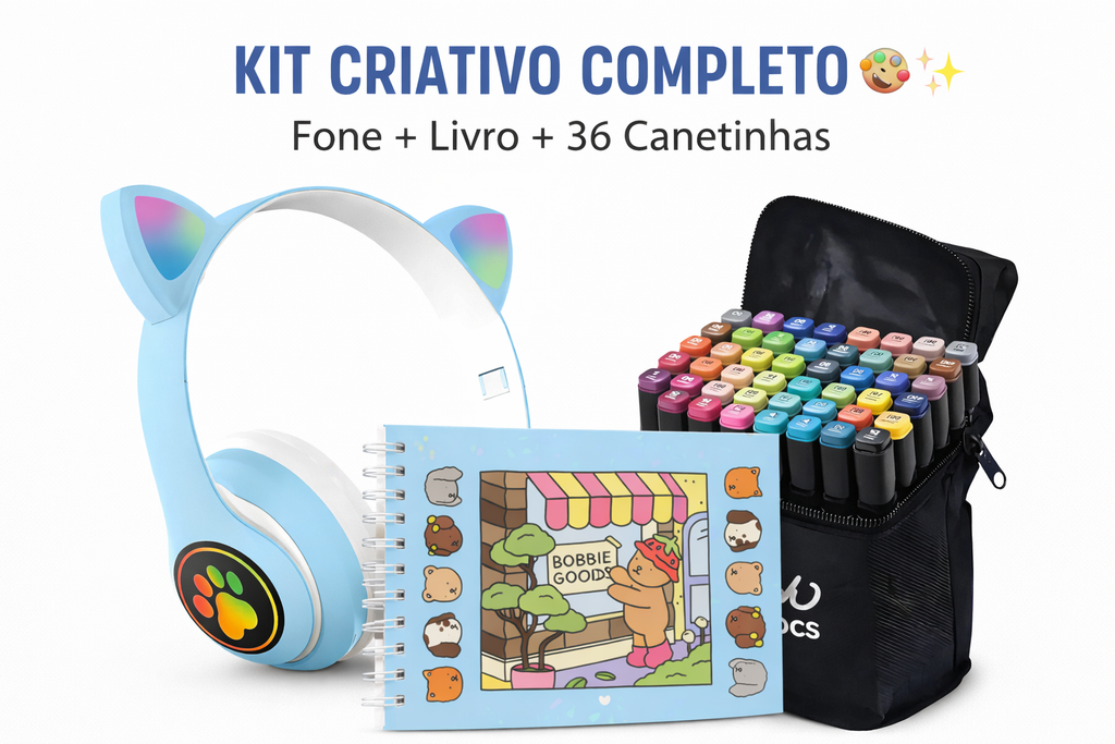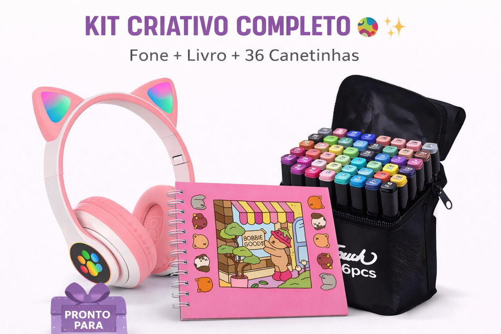 Kit Fone Gatinho + Livro + Canetinhas 36 Cores