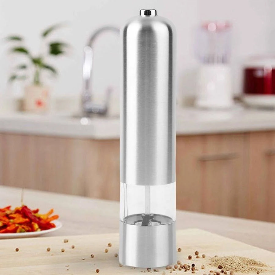 Moedor eléctrico de sal ou pimenta Aço Inox Com uma leve pressão no botão superior você distribui pimenta em seus pratos.Também pode salgar sua carne de churrasco com sal grosso moído. Use-o sua mesa e dê um requinte na sua refeição.Fácil de usar e fácil de limpar. Especificações/Características do Produto- Regulagem para o tamanho dos grãos. - Utiliza 4 pilhas AA (não acompanham). - Corpo externo em aço inox. - Mecanismo interno em cerâmica. - Dimensões 23 x 5,5 cm. - Peso 280 g. Item Incluso: - 1 Moedor eléctrico de sal ou pimenta aço Inox