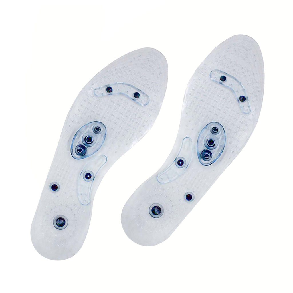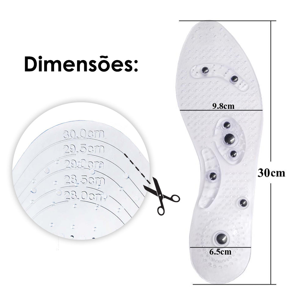 Palmilha Magnética Massagem Terapia Estresse Dores Ansiedade Emagrecimento A Palmilha Magnética para os pés pode promover a circulação sanguínea, reduzir a dor muscular, aliviar o estresse, prevenir o envelhecimento, fortalecer a saúde e manter a imunidade estável. É super confortável e proporciona vários benefícios ao corpo. Pastilhas Magnéticas localizadas em pontos estratégicos que promovem massagem tipo DO-IN, associada a reflexologia. O material de Gel de Silicone promove absorção de choque e o conforto ideal, além de ser ventilado e fácil de limpar. Você pode mudar o tamanho cortando de acordo com a linha de onda disponível, se necessário. Não indicado para portadores de marca-passo Especificações Técnicas: Modelo: Par de Palmilha Magnética Unissex Material: Gel Silicone e Imãs Cor: Transparente Dimensões Aprox.: 9,8 cm (L) X 30 cm (C) Peso: 120g Itens Inclusos na Embalagem: - 01x Par de Palmilha Magnética Unissex