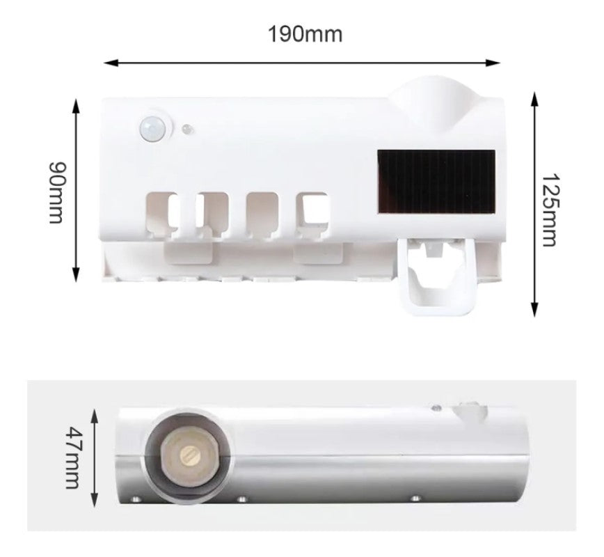 Dispenser Pasta De Dente Esterilizador UV O dispenser de pasta de dente esterilizador com luz uv possui um design compacto e oco, o que garante uma boa ventilação e dificulta e proliferação de bactérias. O carregamento do dispenser por ser via cabo USB ou através da luz solar. Fácil de instalar, seu sistema de indução inteligente garante uma esterilização eficaz. Funciona da seguinte forma: quando uma pessoa se aproxima, a luz acende e o produto entra no modo de funcionamento. Se a pessoa sai, a luz apaga e a luz ultravioleta é ativada após 2h, dando início a esterilização das escovas de dente (processo que dura em torno de 6 minutos). Caso uma pessoa chegue no meio do processo, a esterilização para imediatamente e o produto entra no modo de ativação novamente. O esterilizador só pode ser executado quando ninguém estiver perto para permitir a esterilização completa. Para instalar o creme dental, é preciso apenas girá-lo no sentido horário. Depois de fixo, aperte o creme dental com força até o ar no dispositivo se esgotar e começar a sair. Especificações/Características do produto: Material: ABS Cor: Branco Dimensão: 19 x 12,5 x 4,7 cm Corrente de trabalho: 150mA Capacidade da bateria de lítio: 2600mAh Alimentado por: USB/solar Itens inclusos: 1 Esterilizador de escova de dentes 1 Cabo USB 1 Manual de instruções