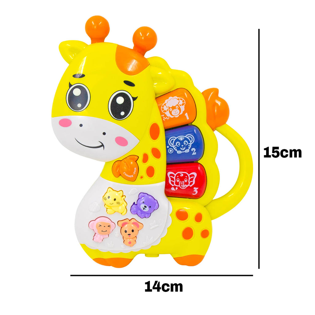Teclado Piano Musical Bebê Brinquedo Infantil Divertido Som O Brinquedo Musical Teclado estimula a percepção de cores e desenvolvimento sensorial e cognitivo, além de ser uma diversão garantida para crianças. Os Sons emitidos despertam a criatividade dos pequeninos, ajudando no desenvolvimento auditivo e coordenação motora. Com lindas melodias, cores vibrantes, texturas suaves, despertando a atenção e interesse do pequeno. Atenção: Não Recomendado para Menores de 18 Meses Especificações Técnicas: – Modelo: Brinquedo Musical Teclado Girafa CY2214 – Material: Plástico, Componentes Eletrônicos. – Funções: 3 com 7 sons diferentes. – Teclas: 8 – Alimentação de Energia: 2 Pilhas AAA(Não Incluso) – Certificação Inmetro / Selo de Segurança: CE-BRI/INNAC – 02484-01A – Dimensões Aprox.: 14cm (Largura) X 15cm (Comprimento) X 3cm (Profundidade) – Peso Aprox.: 120g Itens Inclusos na Embalagem: – 01x Brinquedo Musical Teclado