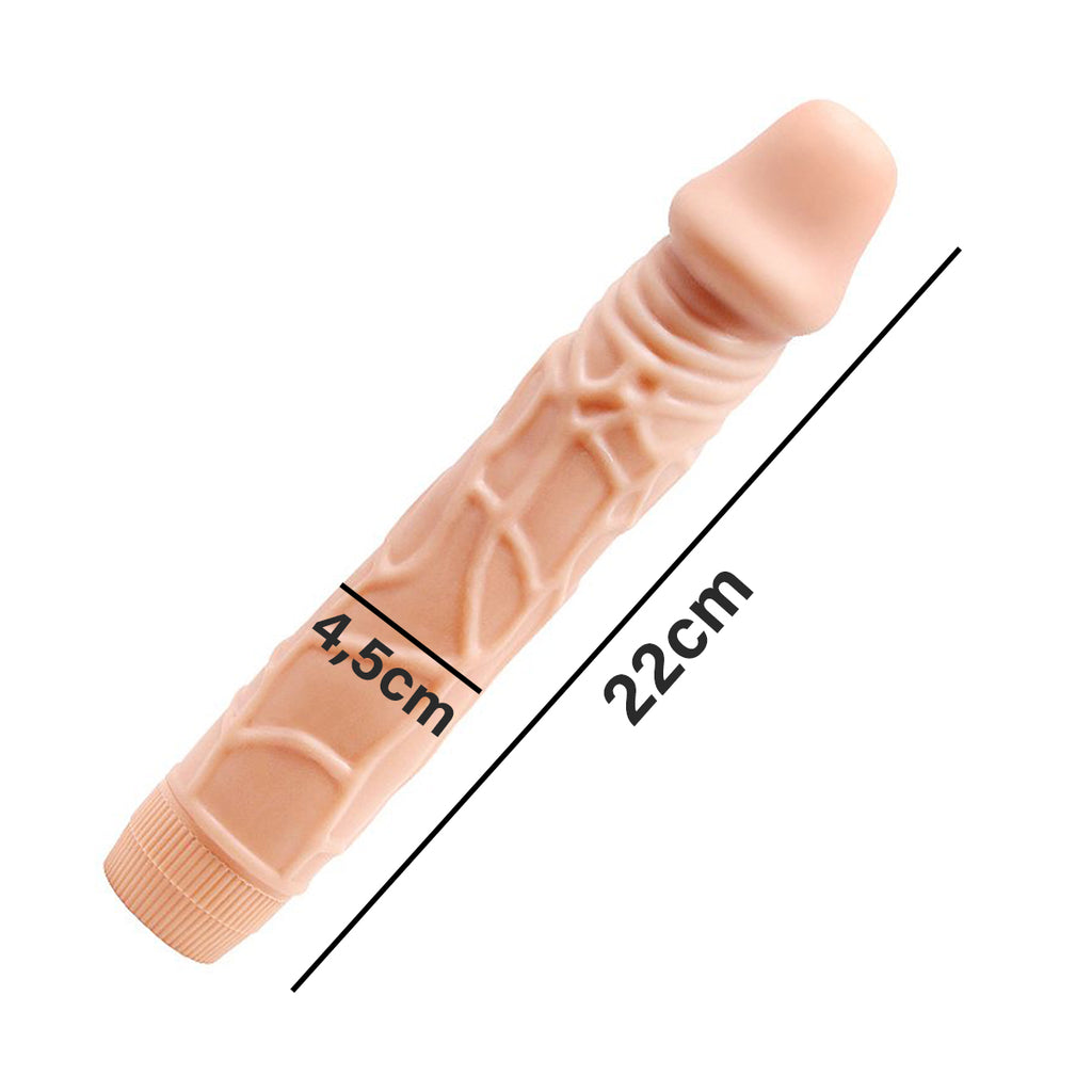 Vibrador Dildo Realístico em formato de pênis com glande definida e textura de veias salientes ao longo do corpo, material macio que se assemelha a pele humana. Possui vibração multivelocidade controlada por botão giratório na base. Com este pênis realístico o usuário sente prazeres diferenciados. Resistente a água. Modo de uso: Lubrificar antes da penetração. Para uso anal ou vaginal. Material: TPR, ABS. Bateria: Utiliza 2 pilhas AA (não inclusas). Medidas: 22,5 cm de comprimento total, 4,5 cm de espessura (medidas aproximadas). Higienização: Guarde na embalagem original. Não compartilhar e não expor a temperatura superior a 50°C. Cuidados: Higienize sempre antes e após o uso; Mantenha fora do alcance de crianças; Manter ao abrigo do calor e luz excessiva; Após o uso, guardar em uma embalagem de plástico, não enrole em papel; Recomendações: Recomenda-se o uso de lubrificante e preservativo.